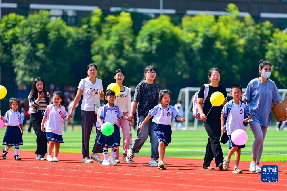 8月31日,在山东省青州市旗城小学,家长带领一年级学生走进操场参加新学期开学典礼。