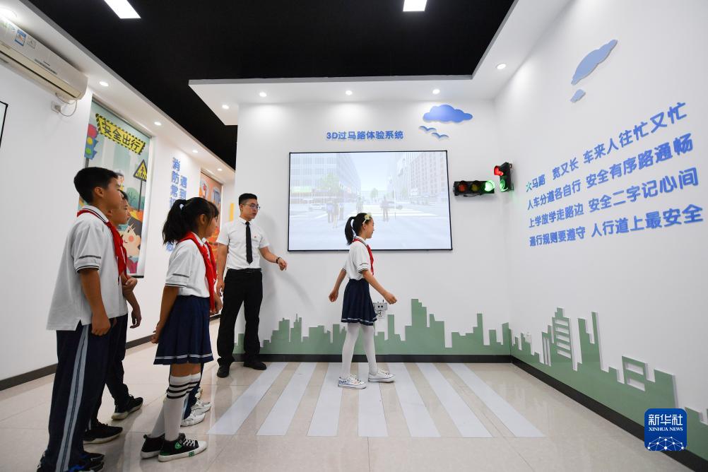8月31日,在西安市鄠邑区新区小学,老师对学生进行道路安全教育。