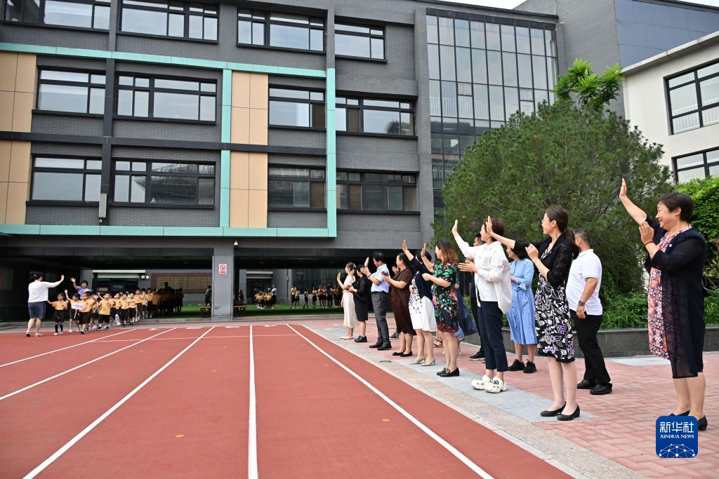 8月31日,北京第二实验小学为一年级新生举办开笔礼。这是老师在开笔礼上迎接新生入场。