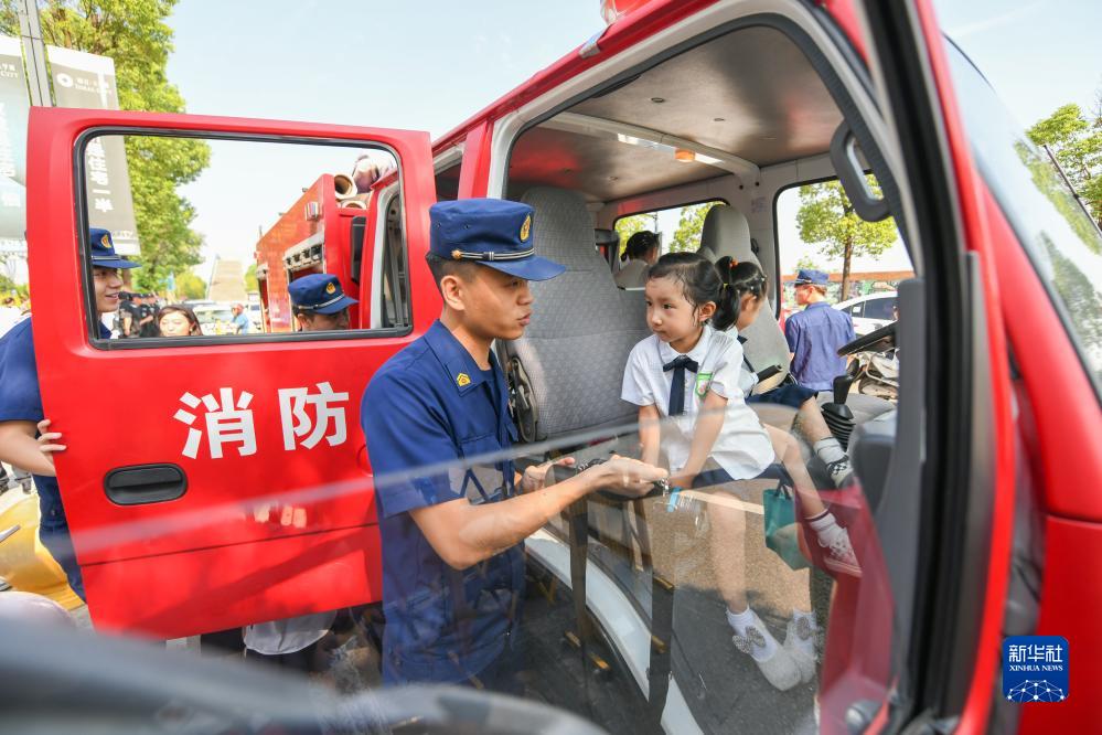 8月31日,在四川省眉山市彭山区学院路幼儿园,眉山市彭山区消防救援大队的消防员为小朋友们介绍消防车上的装备。