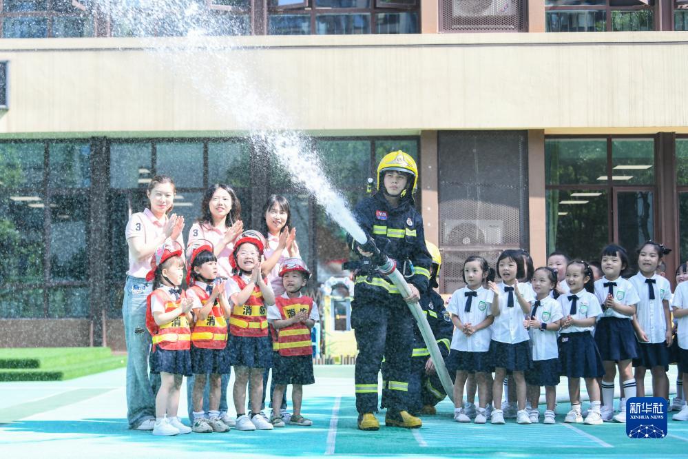8月31日,在四川省眉山市彭山区学院路幼儿园,眉山市彭山区消防救援大队的消防员带小朋友体验消防水枪。