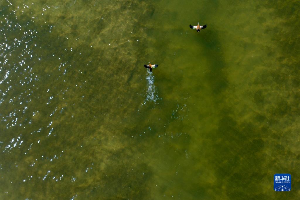 飞鸟从打加错湖面掠过(无人机照片,8月30日摄)。