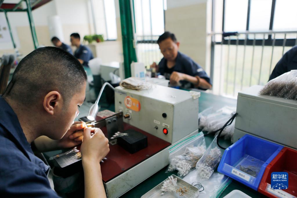 8月30日,在盐城市残疾人托养中心就业托管车间,学员在加工氖灯。