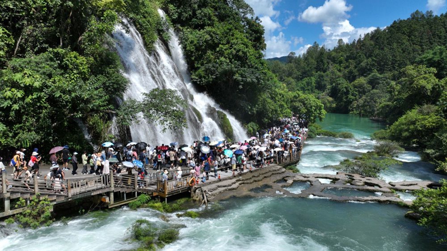 8月15日,游客在贵州省荔波小七孔风景区游玩(无人机照片)。新华社记者 杨楹 摄