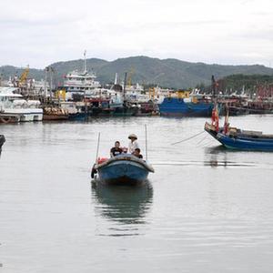 8月31日,在广东省汕尾港避风塘,渔船归港避风(无人机照片)。
