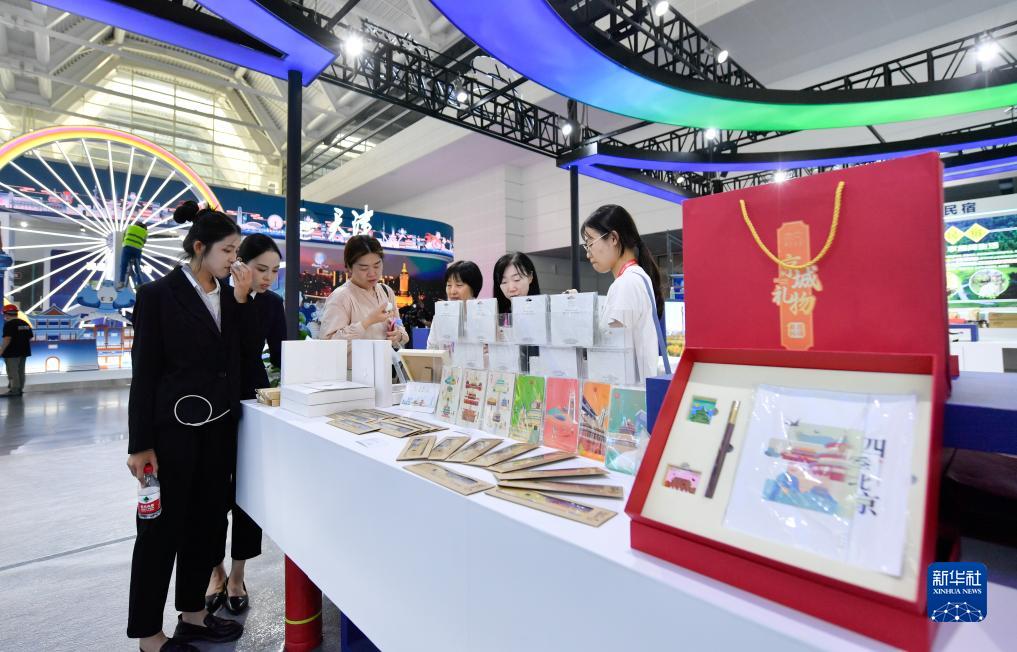 8月31日,在国家会展中心(天津),嘉宾及媒体记者参观展出的旅游文创展品。