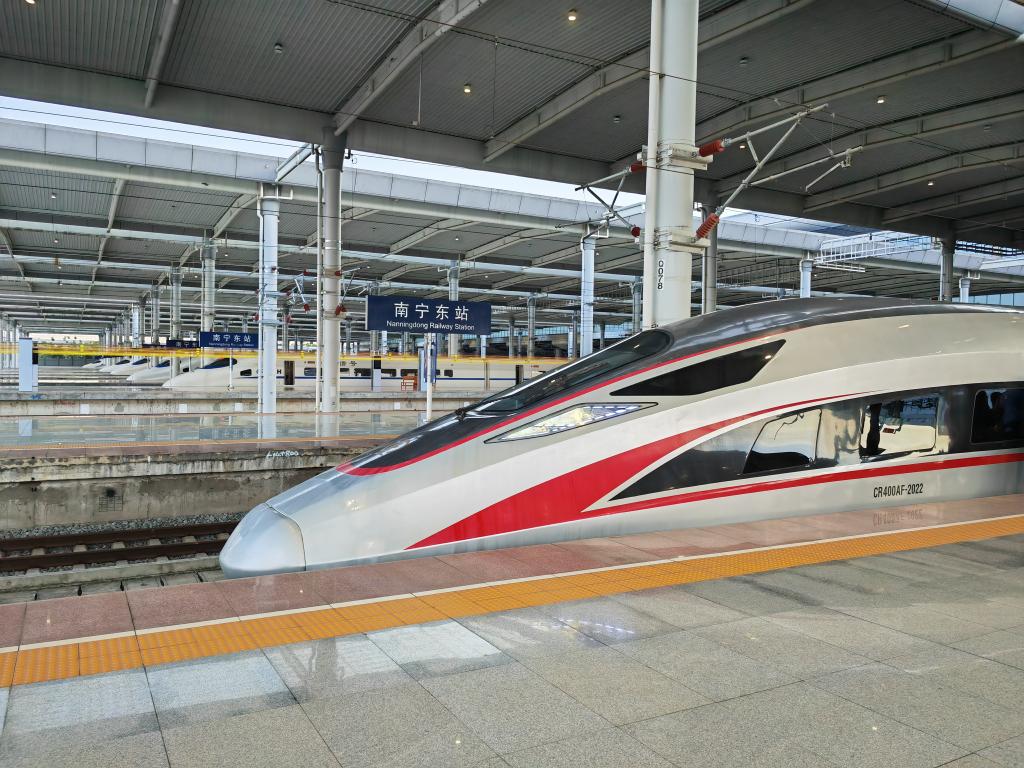 8月31日,G4308次列车从南宁东站缓缓驶出。新华社记者 赵欢 摄