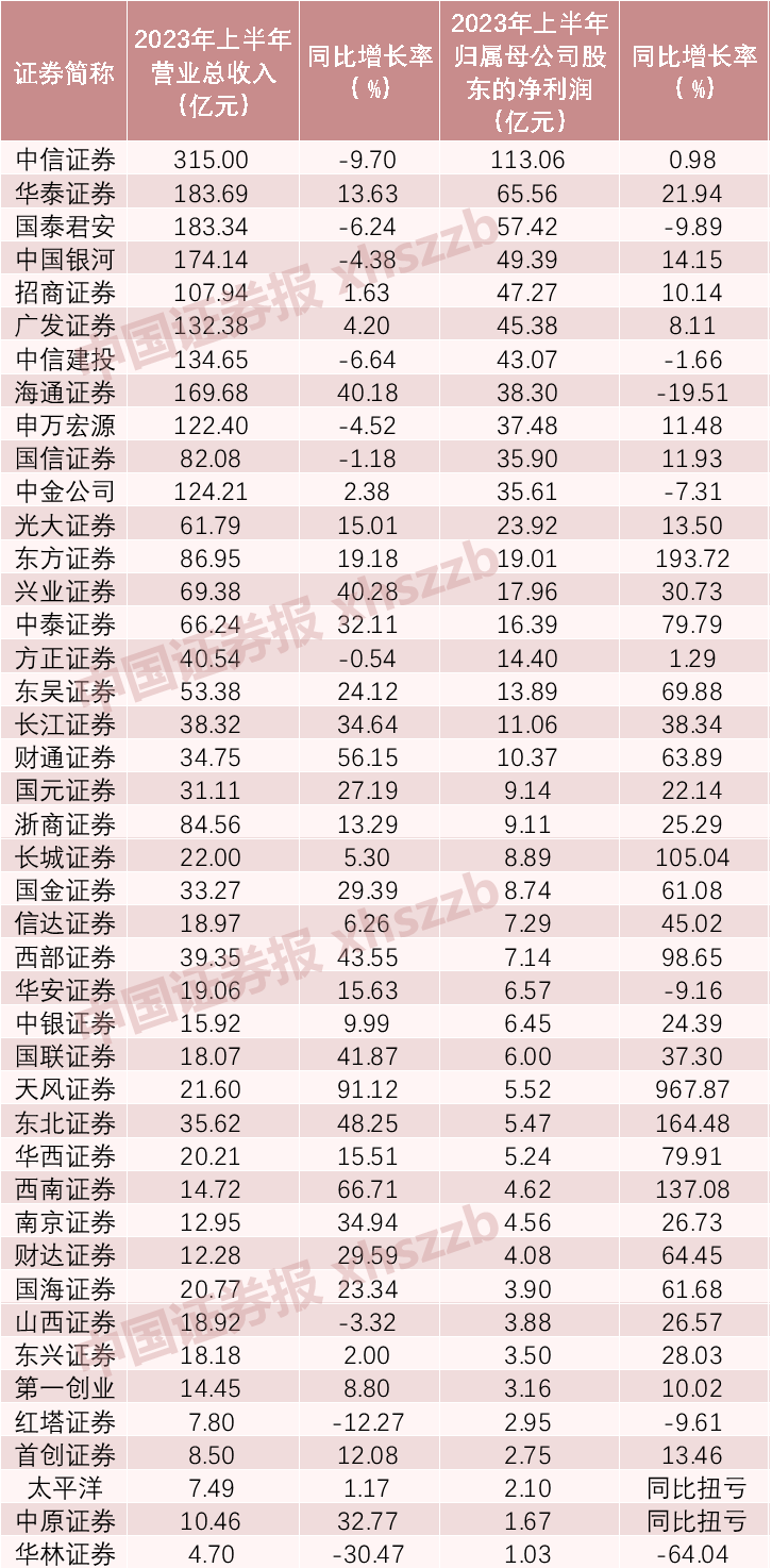 天风证券上半年营收及归母净利润分别为21.60亿元和5.52亿元,同比增速均高居行业首位,分别达到91.12%和967.87%。