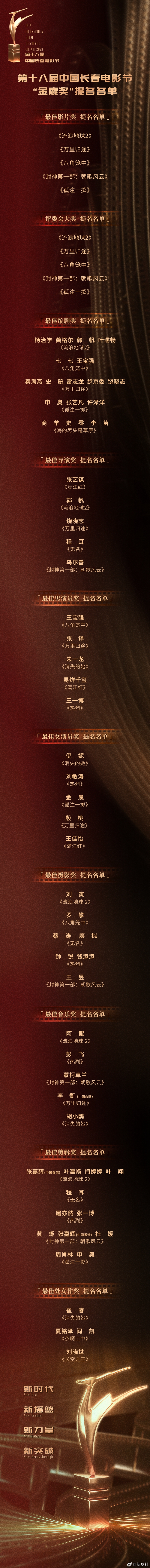 第十八届中国长春电影节“金鹿奖”提名名单正式公布!《流浪地球2》《万里归途》《八角笼中》《封神第一部:朝歌风云》《孤注一掷》5部影片提名最佳影片奖;王宝强、张译、朱一龙、易烊千玺、王一博提名最佳男演员奖;倪妮、刘敏涛、金晨、殷桃、王佳怡提名最佳女演员奖。
