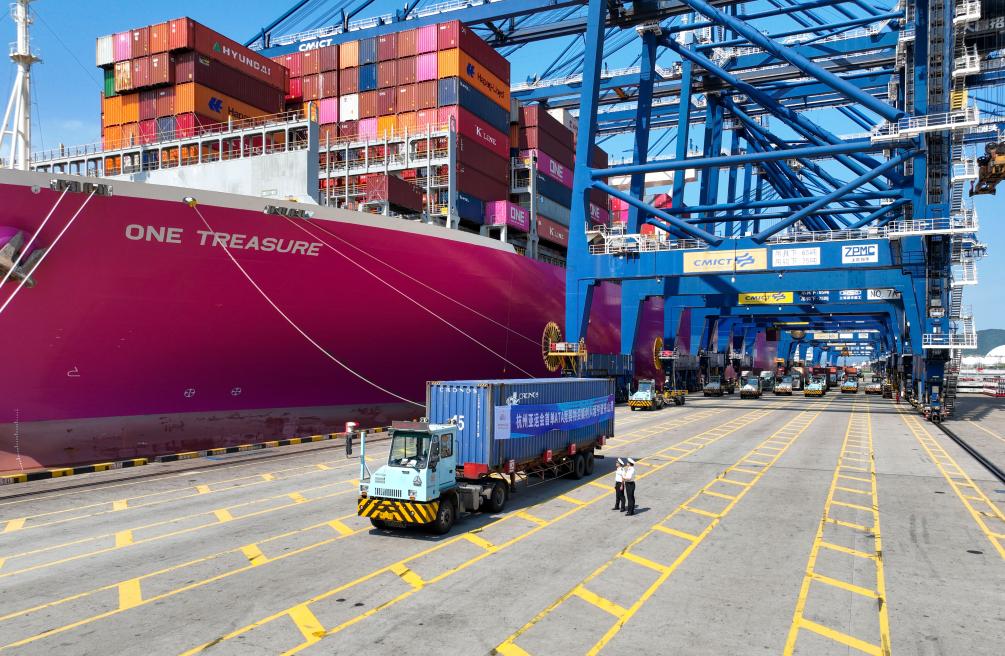 宁波海关所属大榭海关关员对首票ATA单证进境亚运物资开展监装监卸。新华社发(向恋梅 摄)