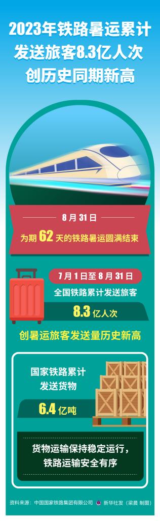 新华社北京9月1日电(记者樊曦)记者1日从中国国家铁路集团有限公司获悉,8月31日,为期62天的铁路暑运圆满结束。7月1日至8月31日,全国铁路累计发送旅客8.3亿人次,创暑运旅客发送量历史新高;国家铁路累计发送货物6.4亿吨,货物运输保持稳定运行,铁路运输安全有序。