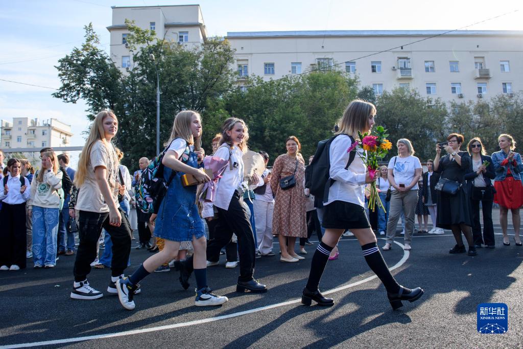 9月1日,在俄罗斯首都莫斯科,学生们参加开学典礼。