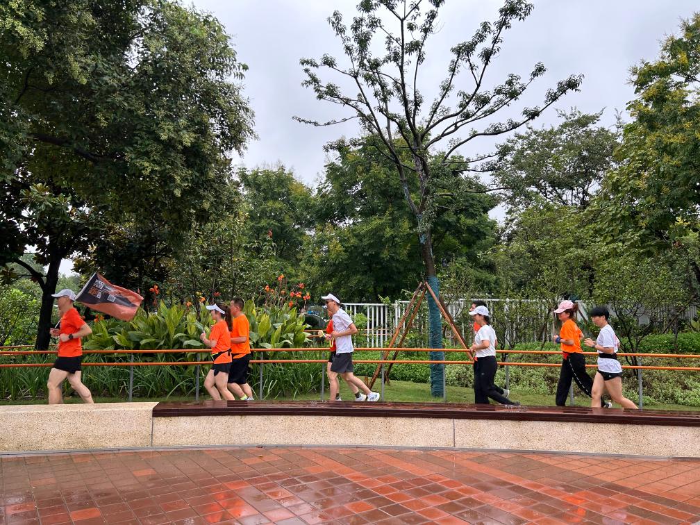 在南京玄武湖的无障碍花园内,由盲人、聋哑人等组成的跑团在志愿者陪跑员的带领下跑步锻炼。(唐玉佳摄)