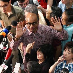 9月1日,新加坡总统候选人尚达曼(中)在裕廊等待总统选举结果揭晓时向支持者致意。新华社发(邓智炜摄)