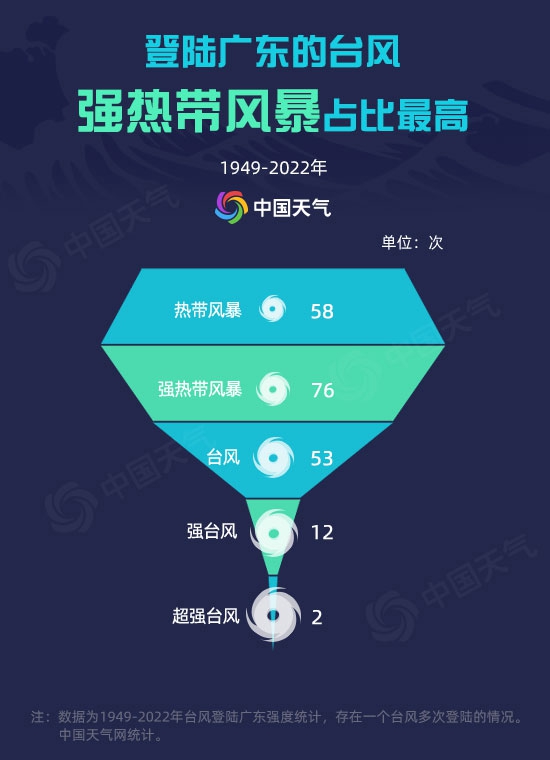 今年以来,先后有“泰利”和“苏拉”两个台风登陆广东,其中“苏拉”为今年以来登陆广东的最强台风。中国天气网统计74年大数据发现,登陆广东的台风中以强热带风暴级别最多,达到强台风以上级别的次数并不多,占比不到一成。
