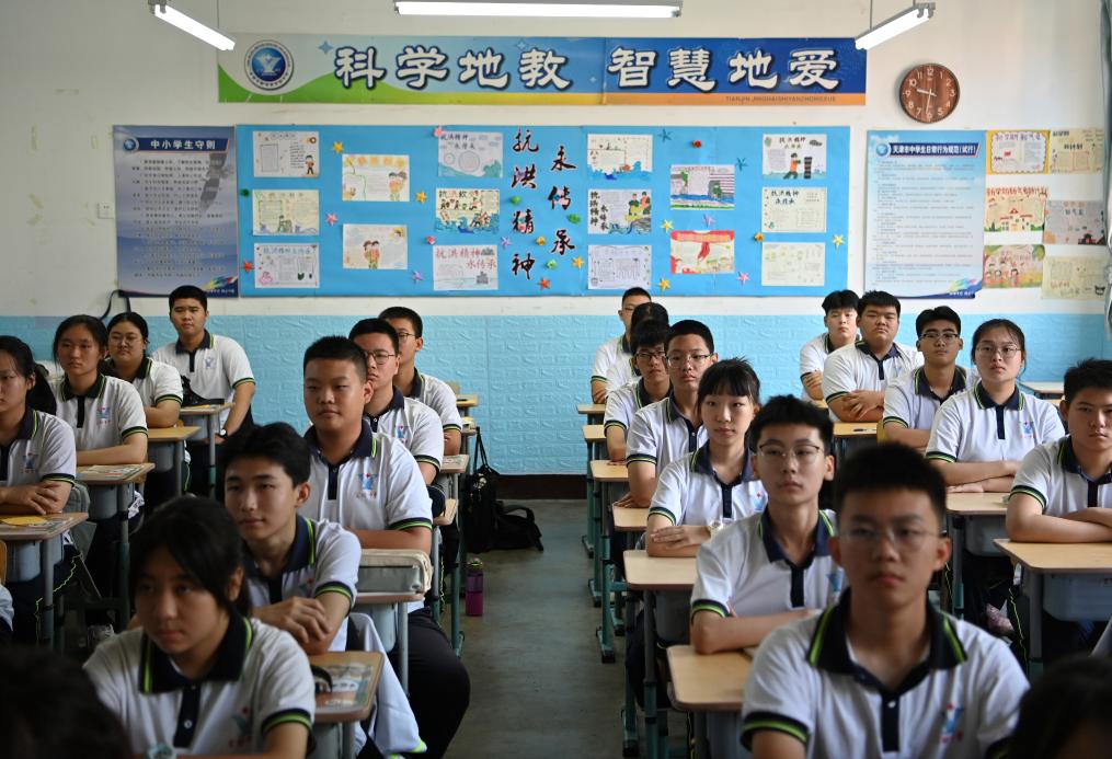 9月1日,在天津市静海区实验中学,学生们在开学第一课上听老师讲述抗洪故事。新华社记者 李然 摄