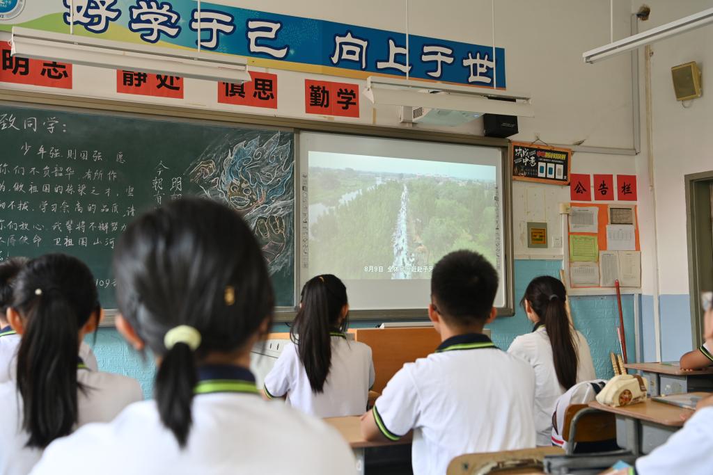 9月1日,在天津市静海区实验中学,同学们在开学第一课上观看抗洪视频。新华社记者 李然 摄