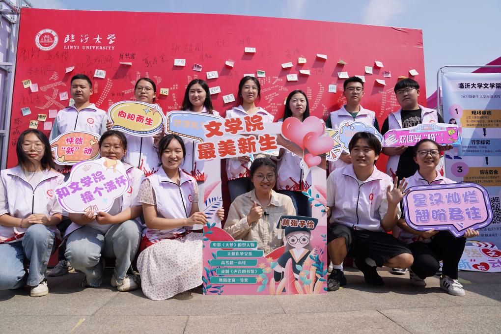 在临沂大学迎接新生现场,蒋张子怡(前左四)与师兄师姐们合影(9月1日摄)。新华社记者 周密 摄
