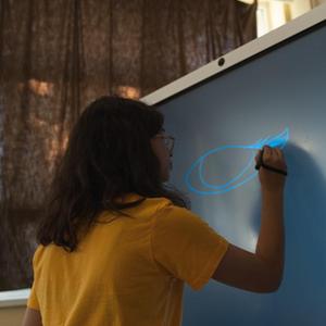 9月1日,在塞尔维亚北部伏伊伏丁那省的一所小学,塞尔维亚总统武契奇(右一)使用华为智慧屏通过视频连线向塞尔维亚多所小学的学生致以开学问候。