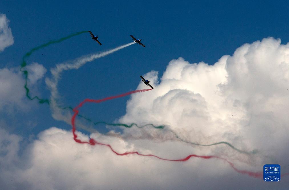 9月2日,在希腊塔纳格拉空军基地的雅典飞行周上,来自意大利的飞行表演队进行表演。