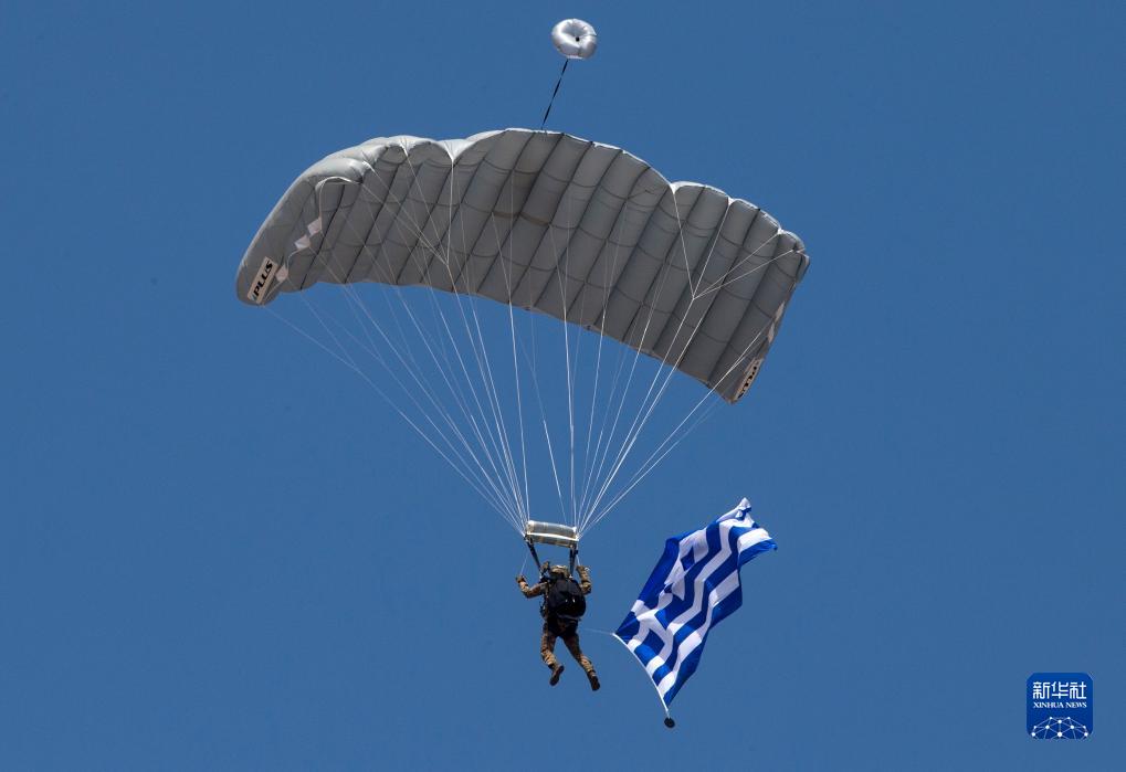 9月2日,在希腊塔纳格拉空军基地的雅典飞行周上,跳伞员在空中展示希腊国旗。