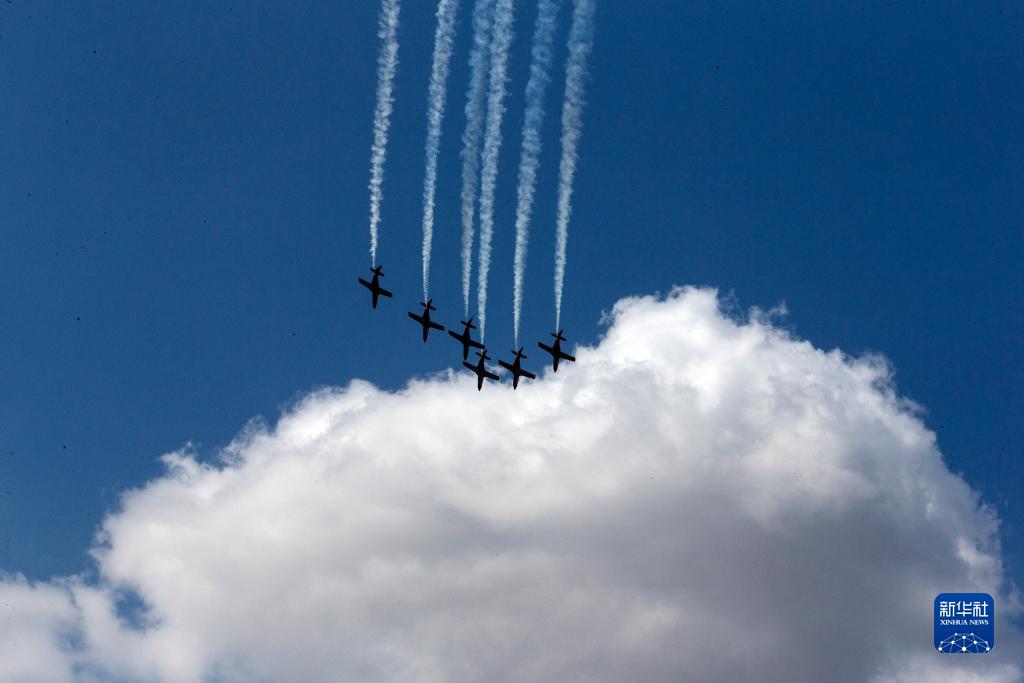 9月2日,在希腊塔纳格拉空军基地的雅典飞行周上,来自西班牙的飞行表演队进行表演。