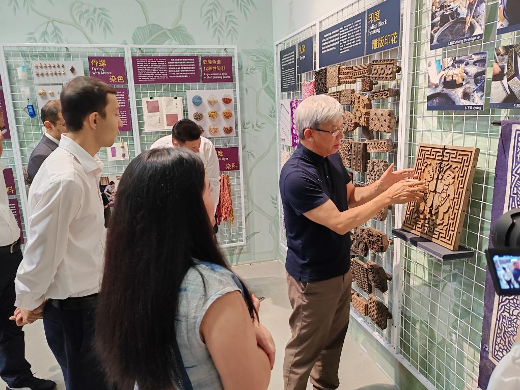9月1日下午,赵丰教授向参观“五彩亚细亚:亚洲服饰展”的外国文博同行介绍不同国家的印染技术。(新华社记者 冯源 摄)