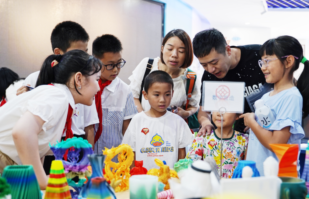 成都七中初中附属小学一年级新生在学校人工智能馆观看3D打印机打印的作品。新华社记者邢拓 摄