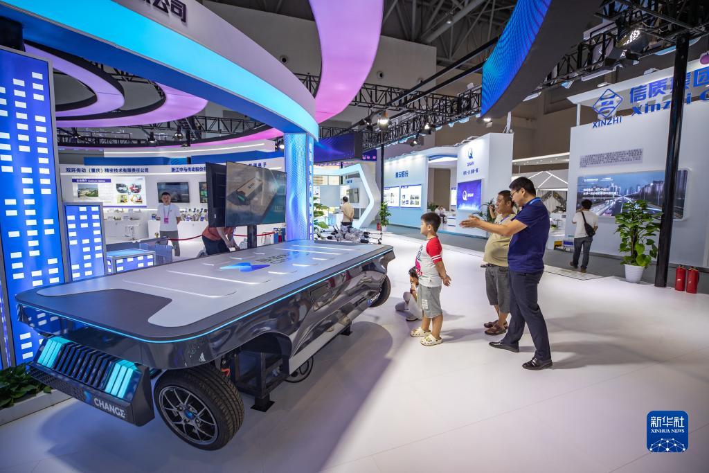9月3日,嘉宾在2023中国国际智能产业博览会展厅内参观智能汽车滑板底盘产品。