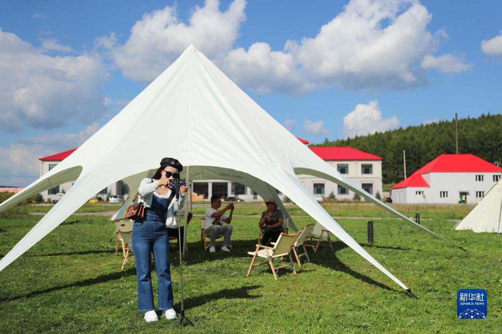 9月1日,游客在阿尔山鹿角湾温泉度假营地拍照。