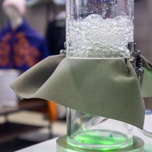 走进国家体育场展厅,一个圆柱形小装置吸引了路过观众围观,装置中间被一块面料分隔,面料上方的水不断冒着丰盈的气泡,下方却没有水渗出。北京中科海势科技有限公司董事长段宇晶说,这是在展示面料的透气性与防水性。公司刚刚达成了一笔采购意向。