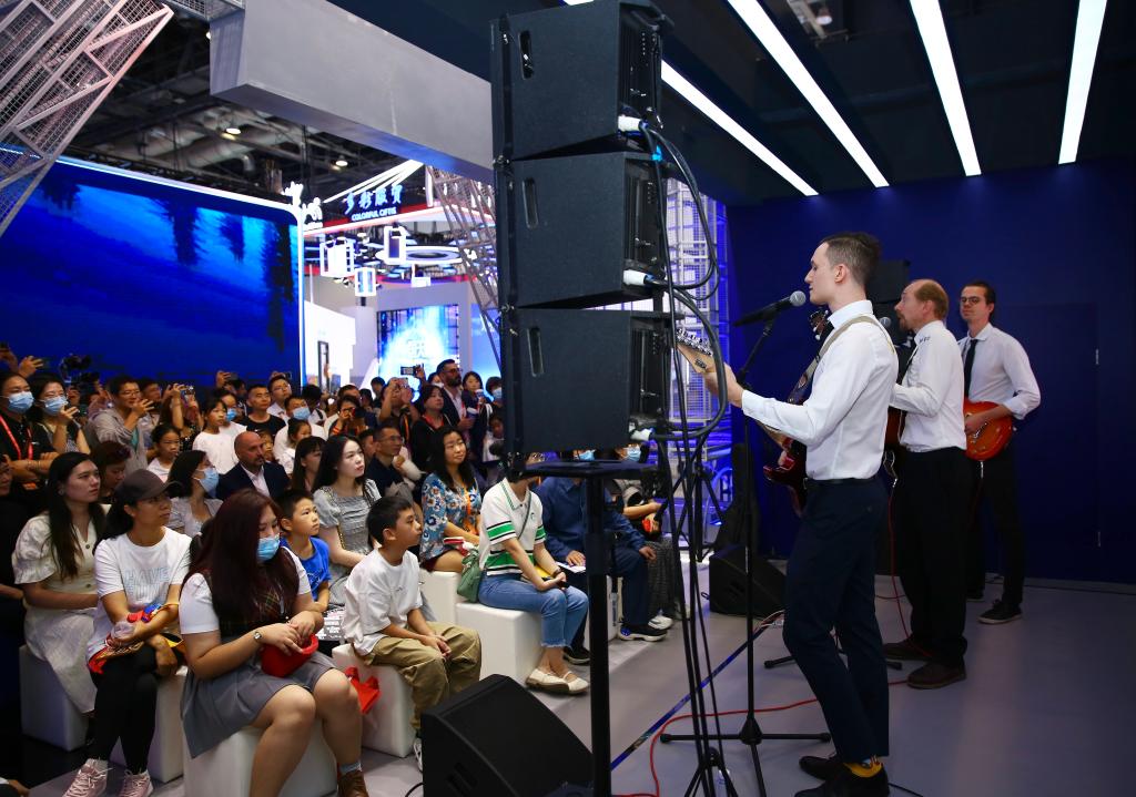 9月3日,歌手在位于国家会议中心的英国展馆表演。新华社记者 孙玮彤 摄