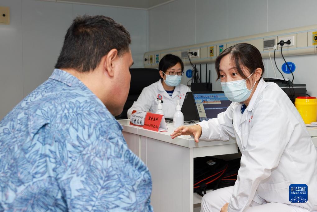 中国海军“和平方舟”号医院船靠泊汤加王国期间,医院船医生使用英语问诊(7月29日摄)。新华社发(李珂嘉贺 摄)
