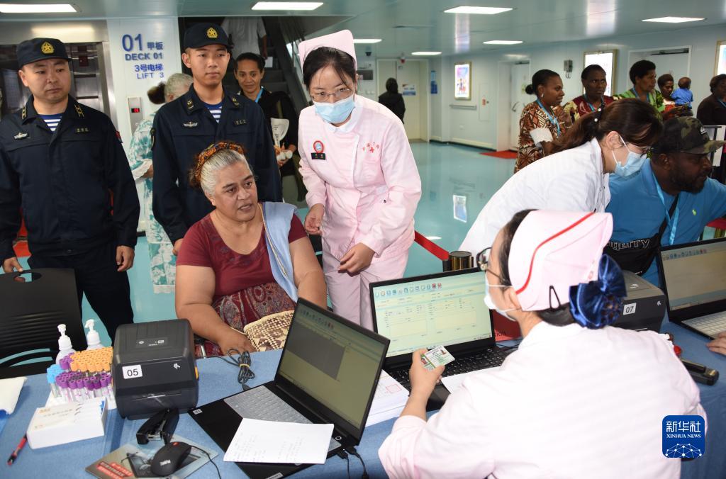 中国海军“和平方舟”号医院船靠泊汤加王国期间,中汤医护人员联合开展医疗服务(8月3日摄)。新华社记者 黎云 摄