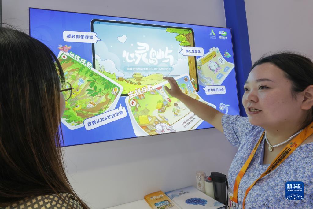 9月4日,在首钢园健康卫生服务专题展区,工作人员在北京安定医院展台讲解基于AI的抑郁症辅助治疗系统。