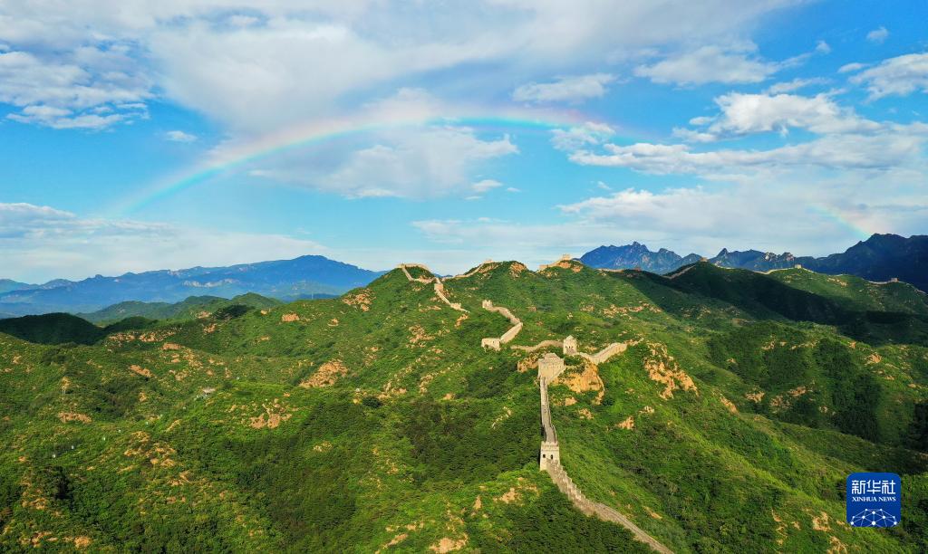 金山岭长城与彩虹交相辉映(8月31日摄,无人机照片)。