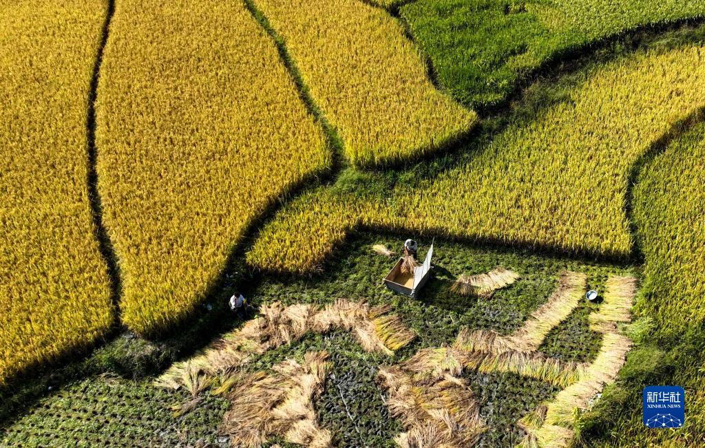 9月5日,村民在贵州省开阳县禾丰乡底窝坝水稻种植示范区收割水稻(无人机照片)。