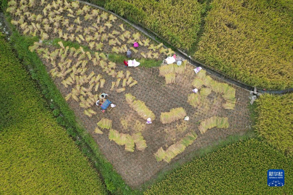 9月4日,村民在贵州省黔东南苗族侗族自治州黄平县旧州镇草芦坪村收割水稻(无人机照片)。