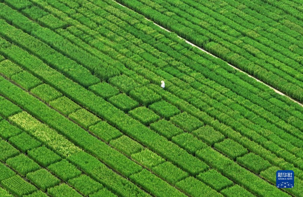 9月4日,农民在江苏里下河地区农科所(扬州市农科院)试验田里劳作(无人机照片)。