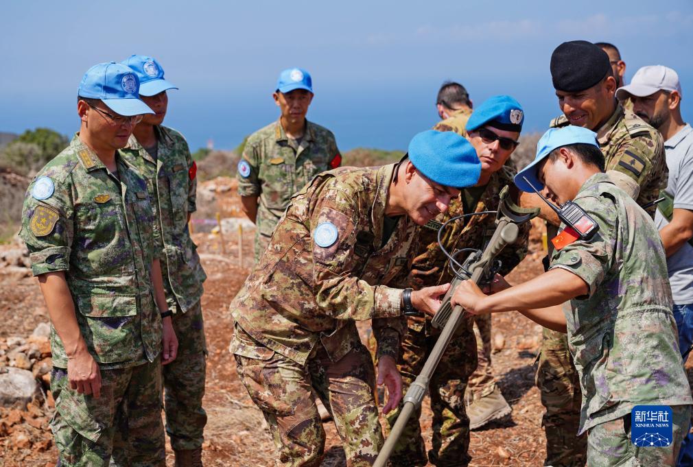 9月4日,在黎巴嫩南部“蓝线”附近雷场,联合国驻黎巴嫩临时部队(联黎部队)西区司令乔瓦尼·布拉法准将(前右二)查看探雷器。