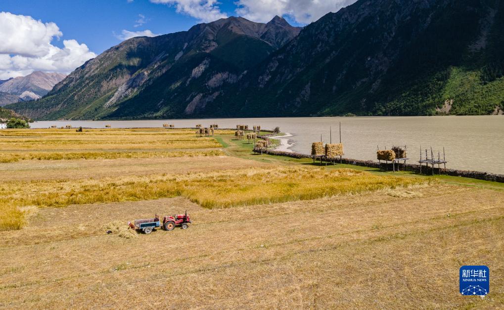 位于西藏昌都市八宿县境内的然乌湖是西藏东部最大的湖泊,八宿县然乌镇瓦巴村坐落在然乌湖畔。正值秋收农忙时节,大片金黄的青稞在风中摇曳,然乌湖景与秋收盛况交相辉映,勾勒出一幅优美的田园画卷。