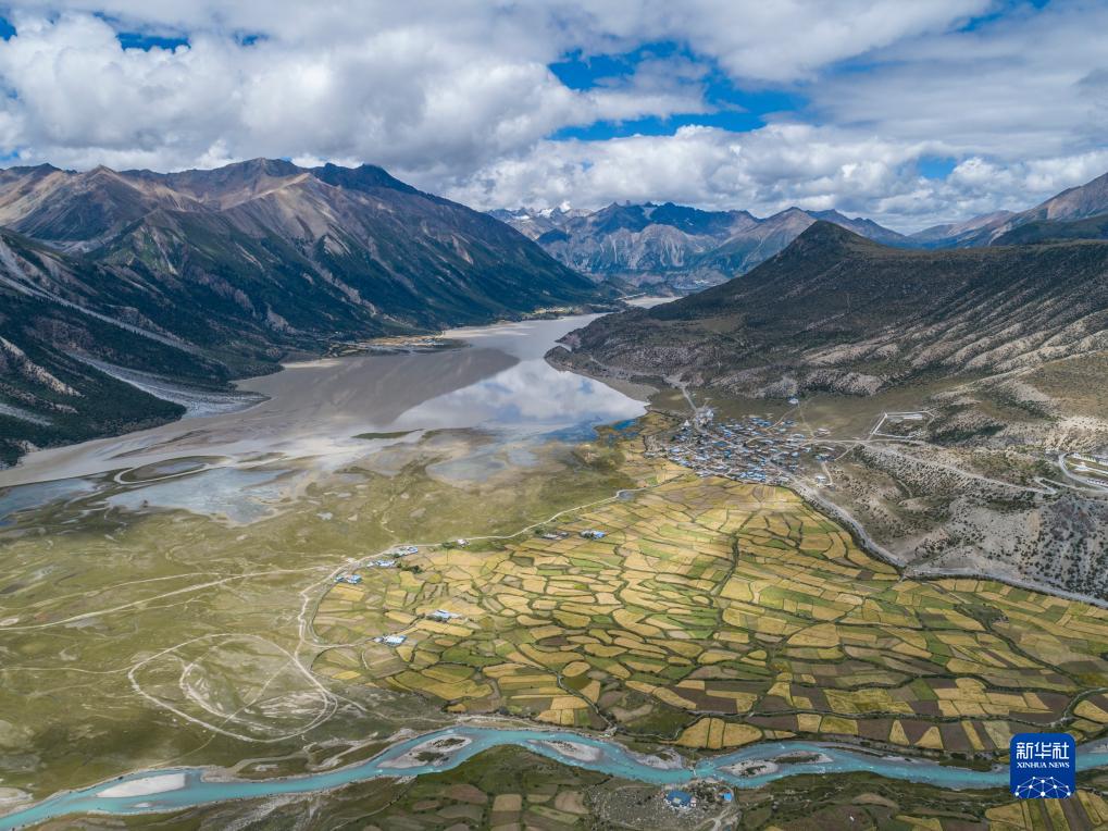这是然乌湖畔的农田(9月4日摄,无人机照片)。