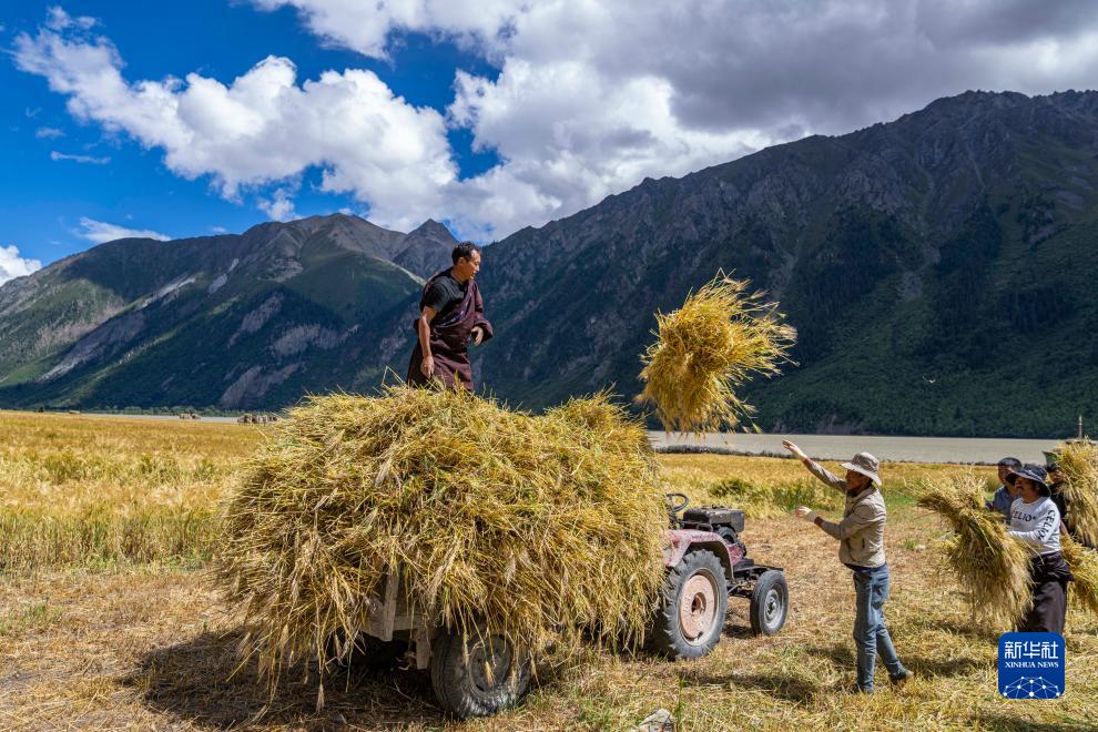 西藏昌都市八宿县然乌镇瓦巴村村民将收割完的青稞装上拖拉机(9月4日摄)。