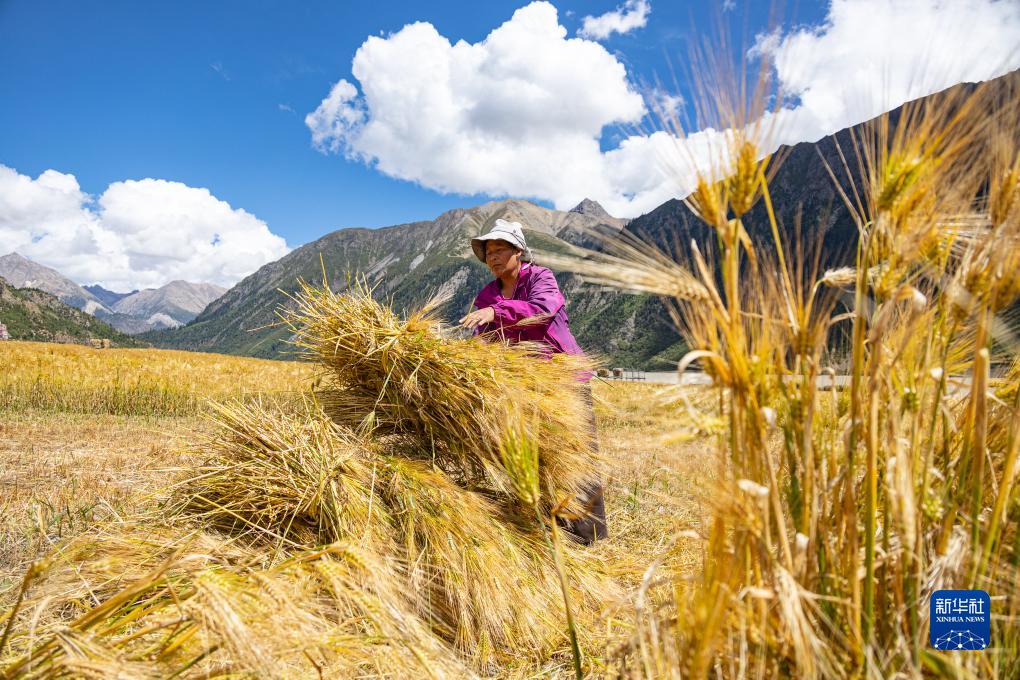 西藏昌都市八宿县然乌镇瓦巴村村民在捆绑刚割下来的青稞(9月4日摄)。