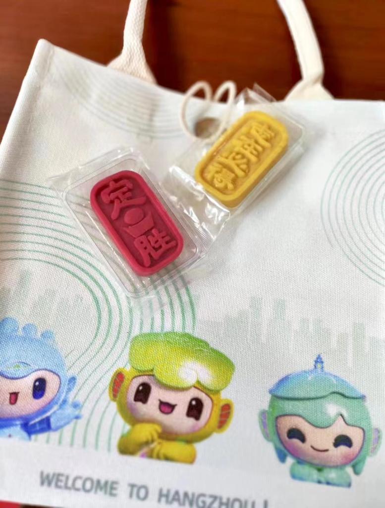 “志愿者们可以在手账本上记录志愿服务过程中的点点滴滴,留下美好的亚运回忆;特制的行李卡牌可以帮助他们标记自己的物品和行李;而一红一黄两块定胜糕上面分别写有‘定胜’以及‘志在必得’的字样,则是为他们加油打气。”杭州亚运村人事与志愿者管理中心副主任、浙江外国语学院团委书记邱萍说。