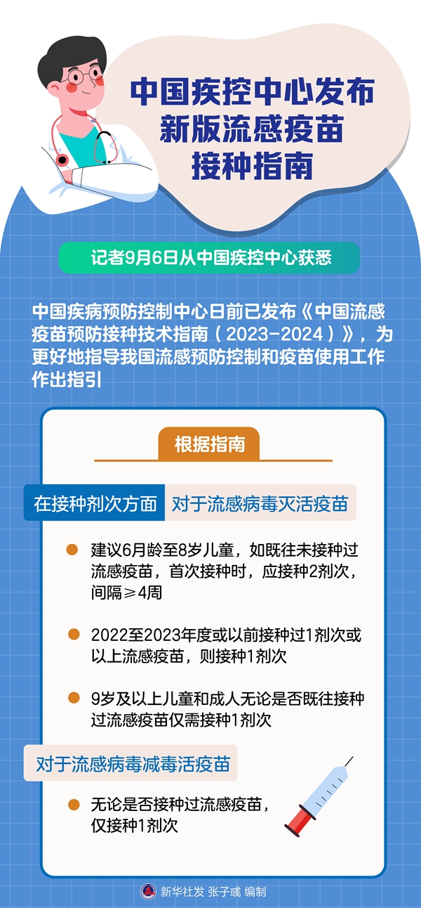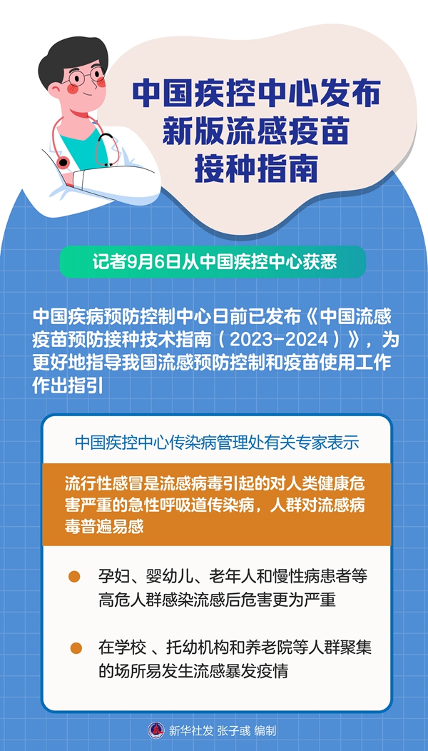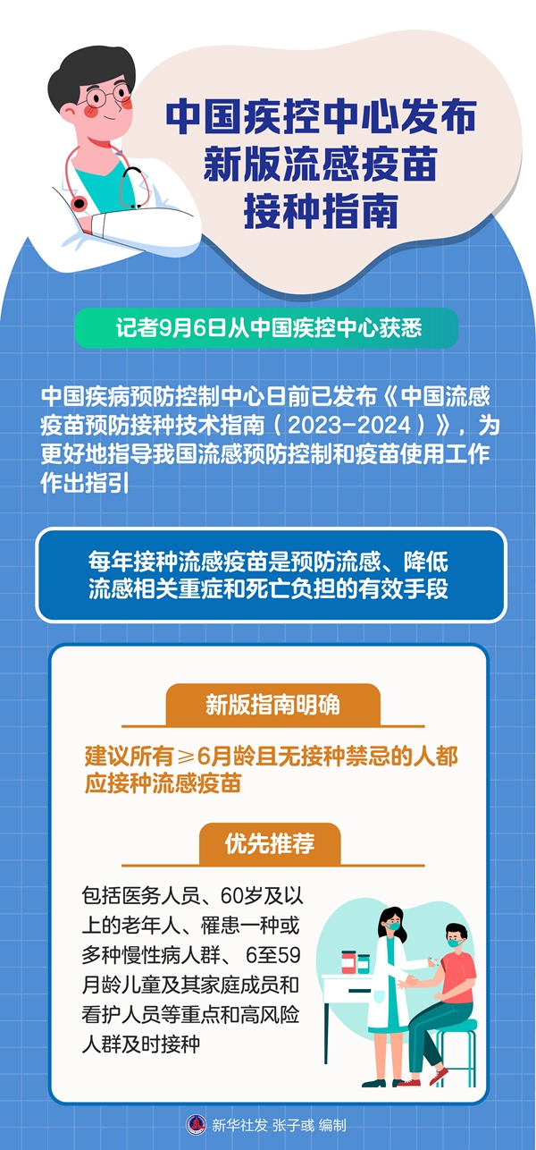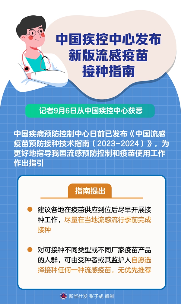 新华社北京9月6日电(记者顾天成)增加新研究证据、更新流感防控有关政策和措施、更新2023至2024年度国内上市使用的流感疫苗种类与接种建议……记者6日从中国疾控中心获悉,中国疾病预防控制中心日前已发布《中国流感疫苗预防接种技术指南(2023-2024)》,为更好地指导我国流感预防控制和疫苗使用工作作出指引。