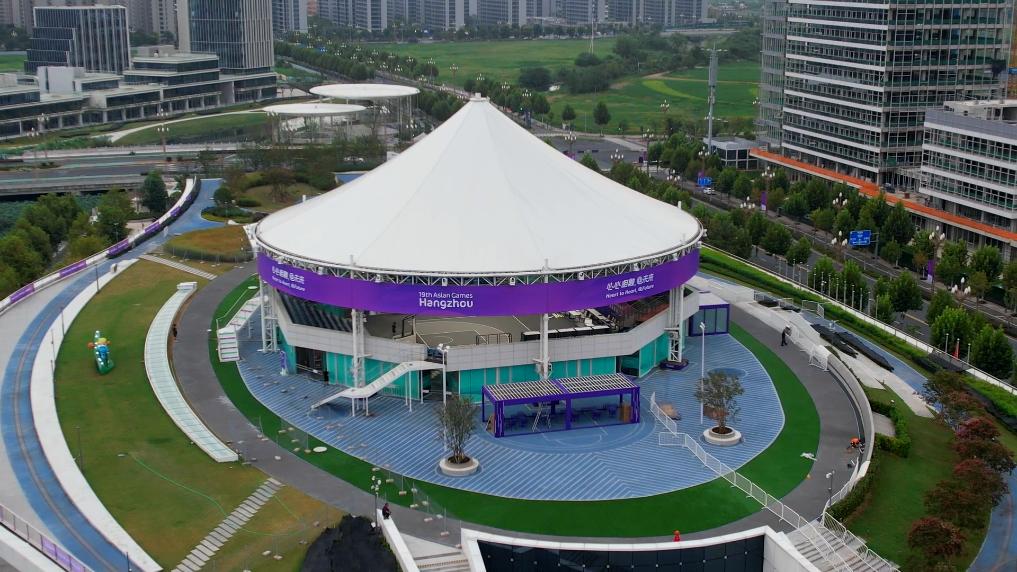 从远处眺望篮球场,建筑起伏的天际线呼应了江南水乡的地域特色。“绿色亚运”“智慧亚运”的办赛理念已融入亚运场馆的建设运营之中。