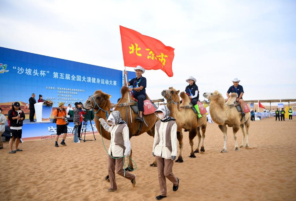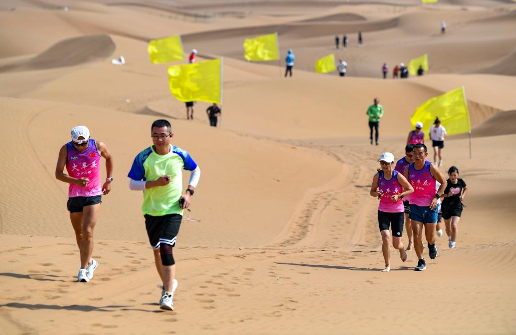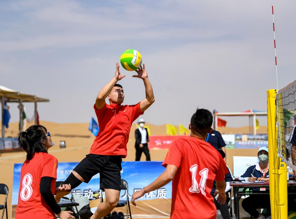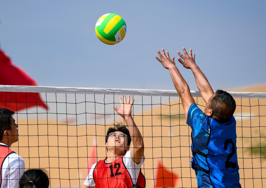宁夏同心县代表队(左)与宁夏银川市队在沙漠排球比赛中。