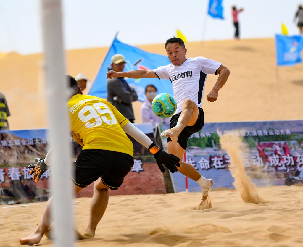 江苏常州代表队选手陈军(右)在与宁夏贺兰县队的沙漠足球比赛中射门。