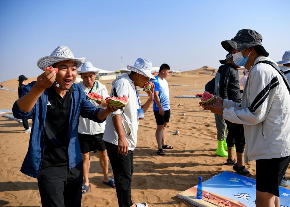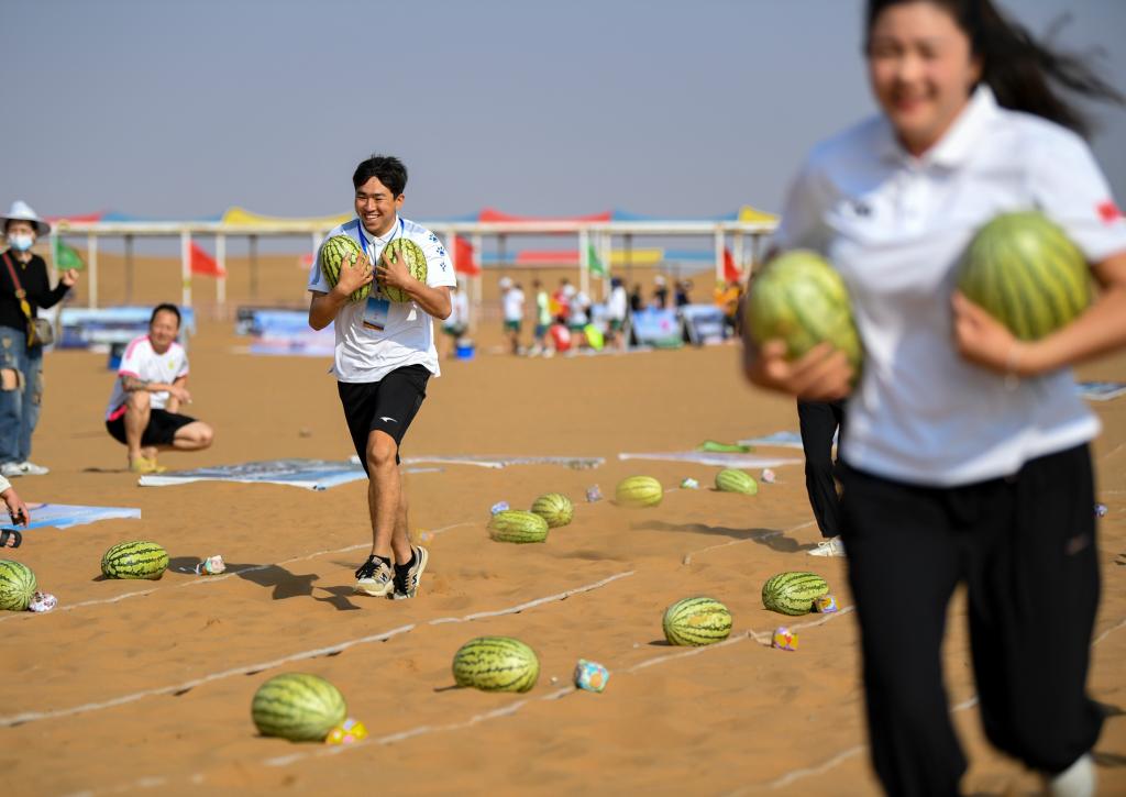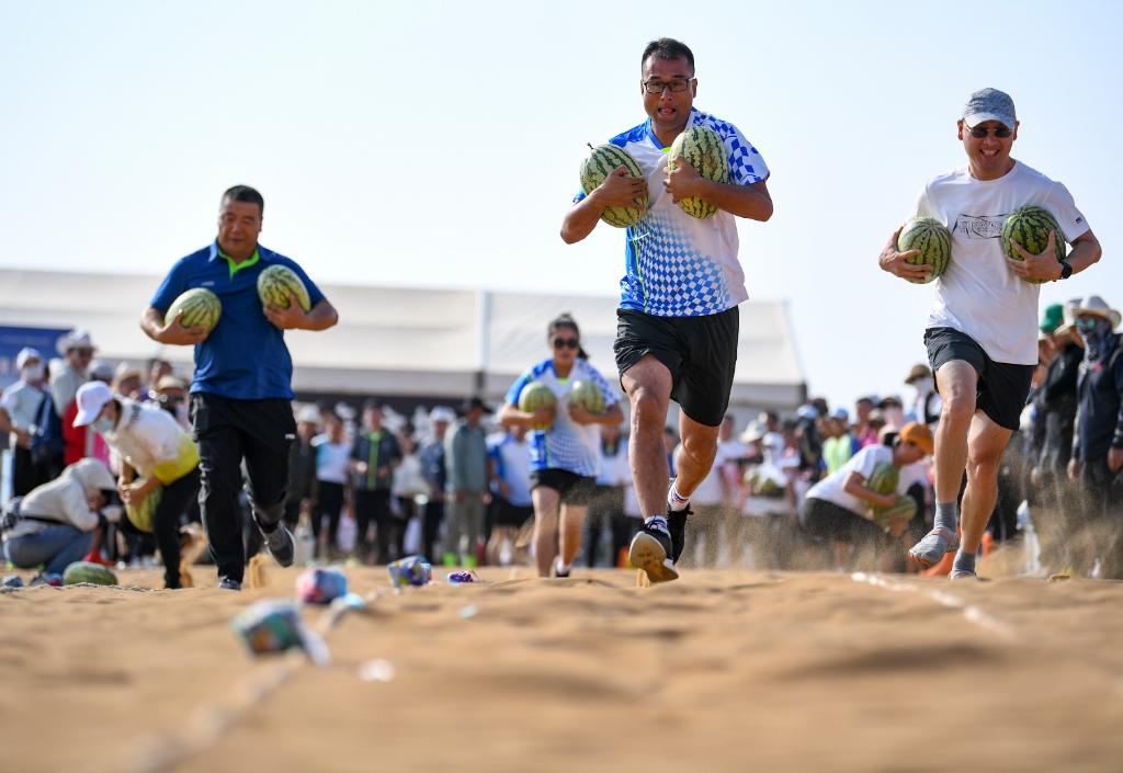参赛选手在抢种抢收硒砂瓜比赛中。